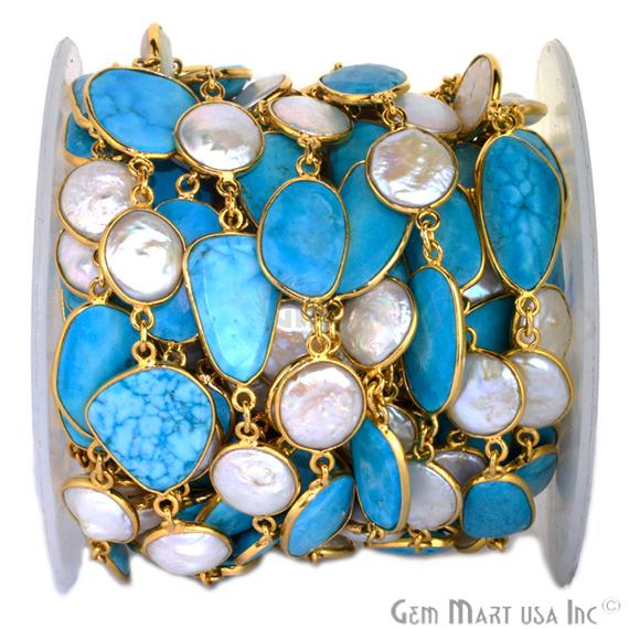 Turquoise With Pearl Bezel Link Gold Plated Continuous Connector Chain