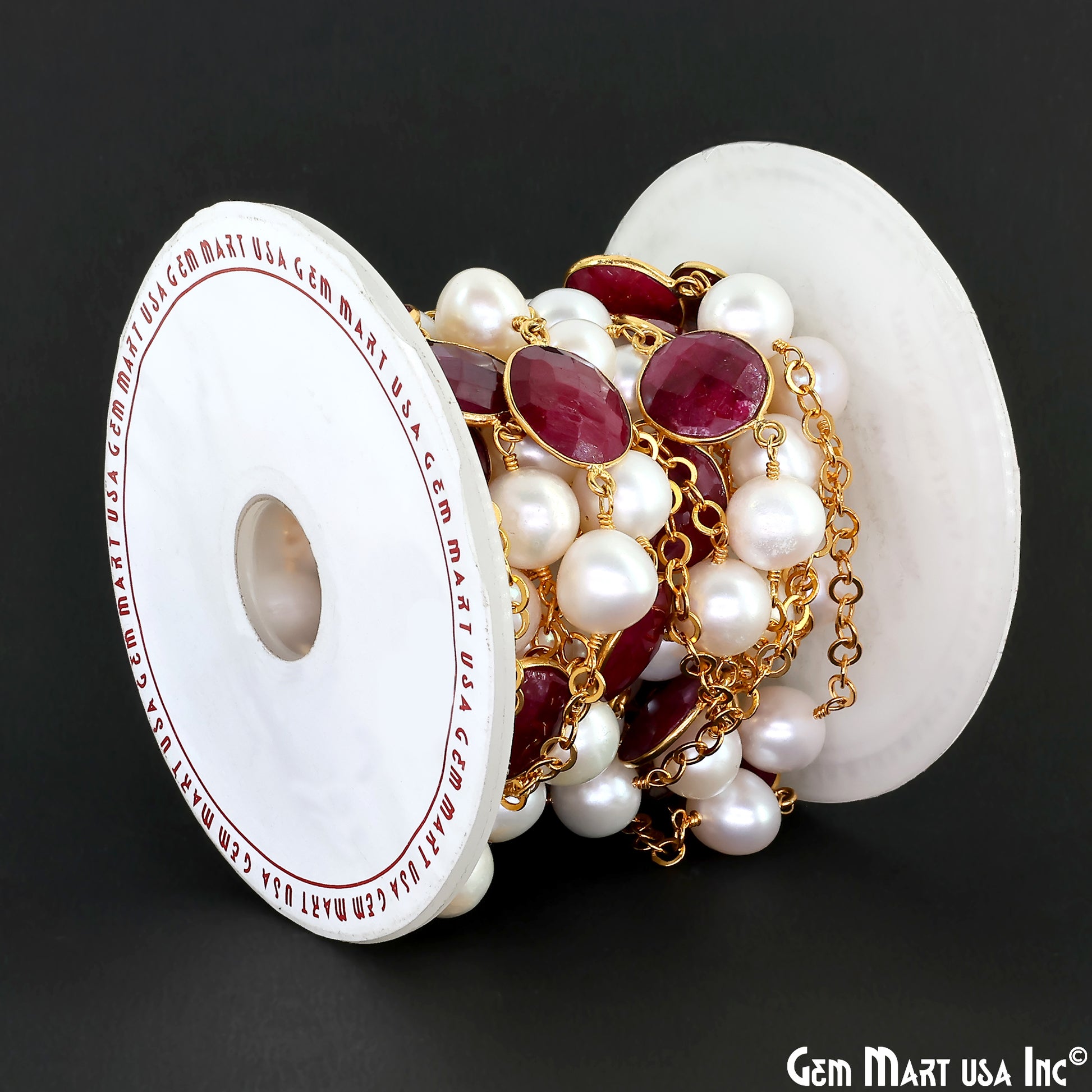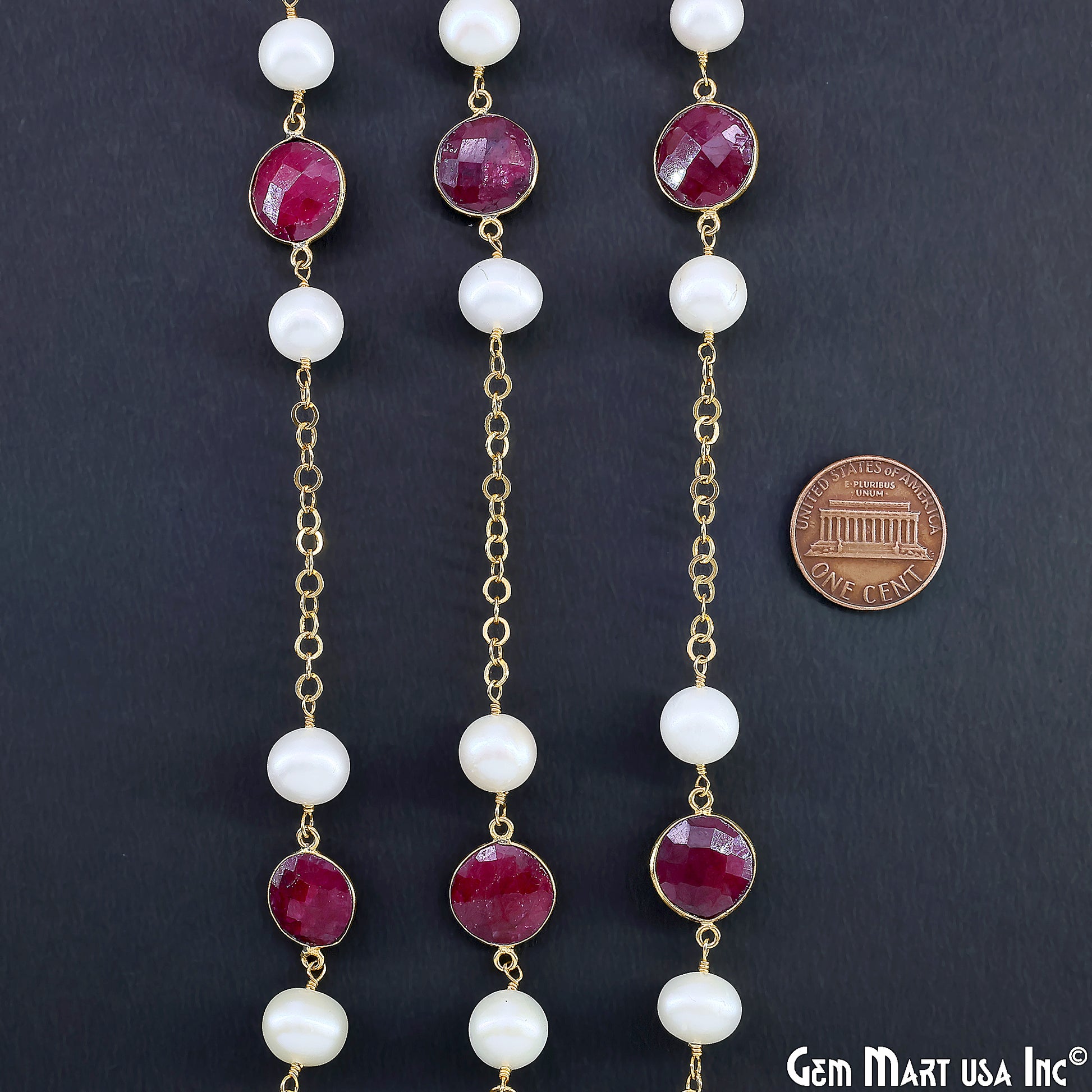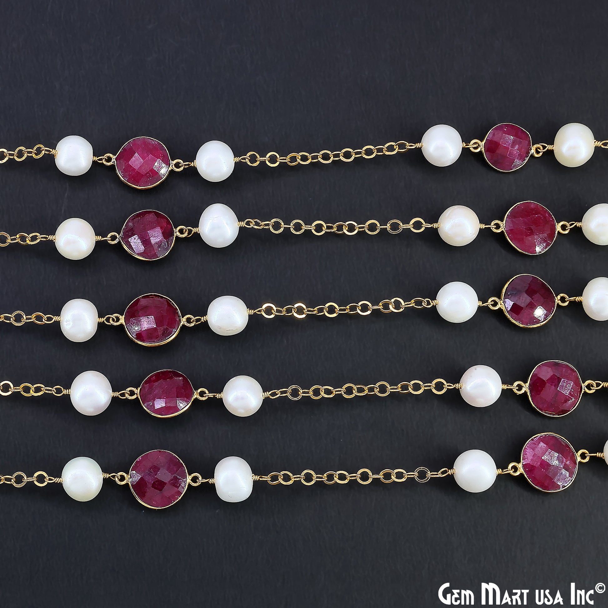Ruby And Pearl Beads Gold Plated Round Shape Bezel Link Continuous Connector Chain