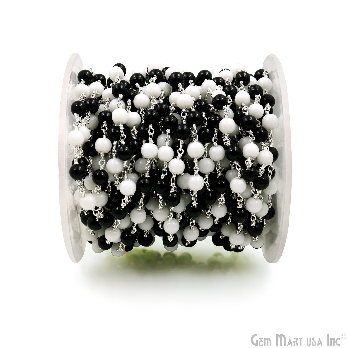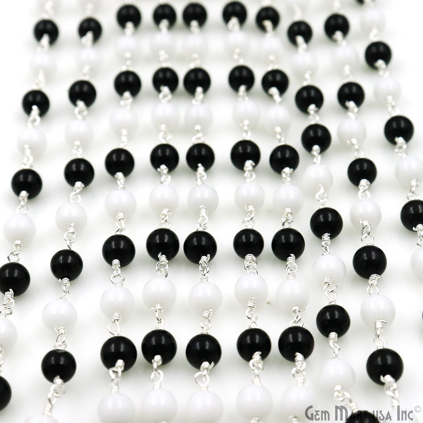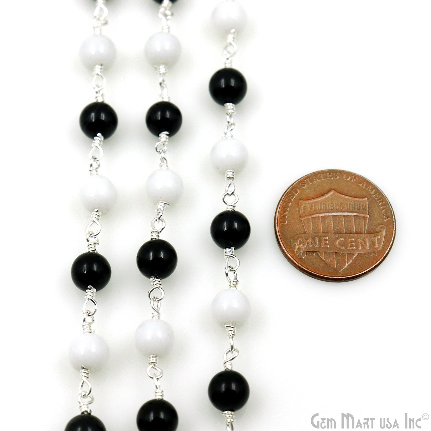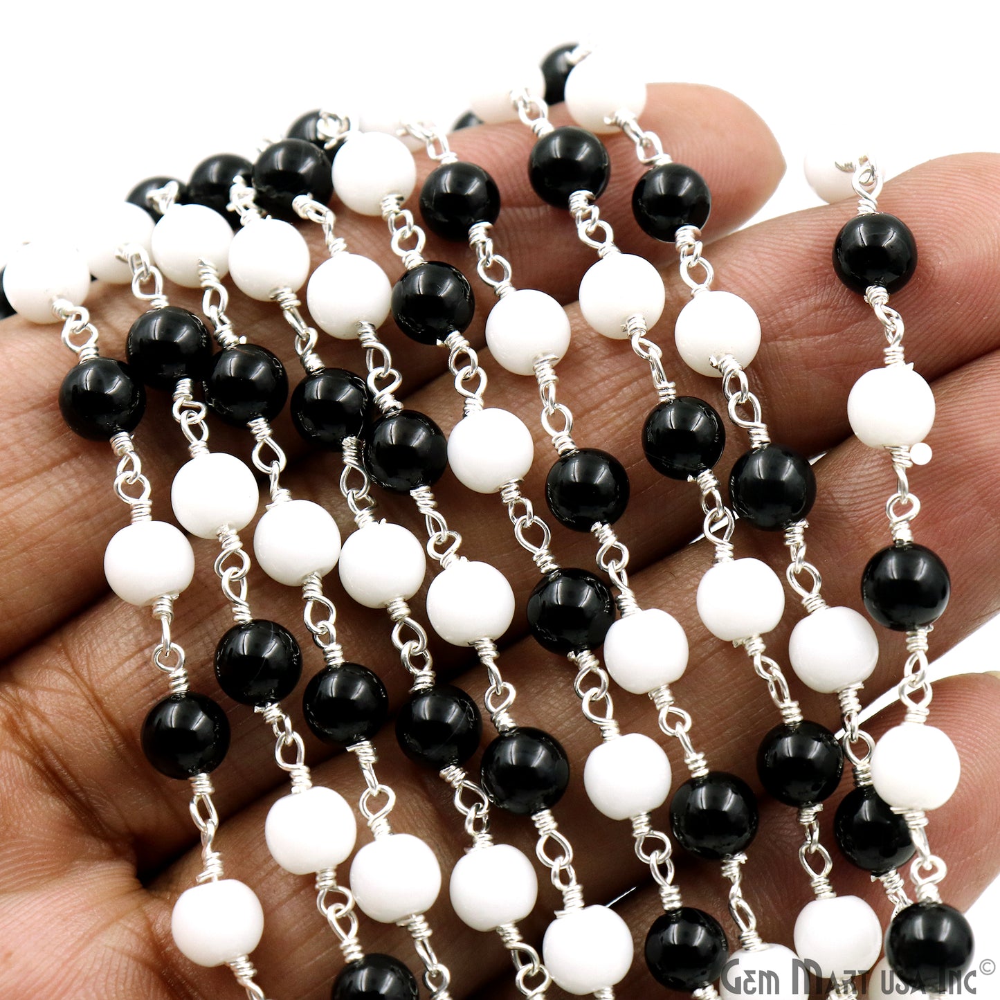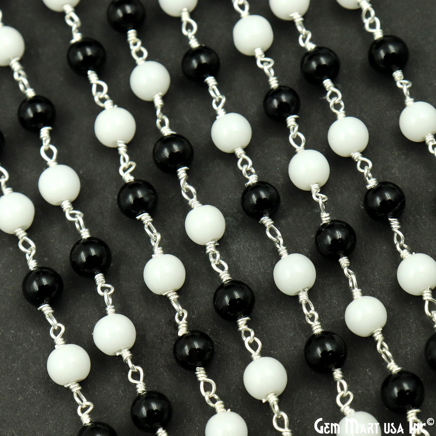 Black Spinel & White Agate 6mm Silver Plated Smooth Beads Wire Wrapped Rosary Chain