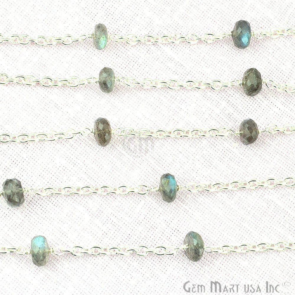 Labradorite Rondelle Beads Chain, Silver Plated Wire Wrapped Rosary Chain