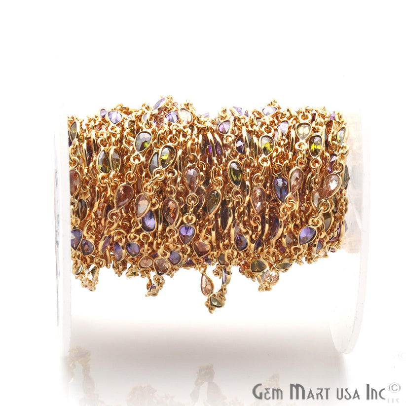 Multi Color Zircon 6x4mm Pear Shape Gold Plated Continuous Connector Chain