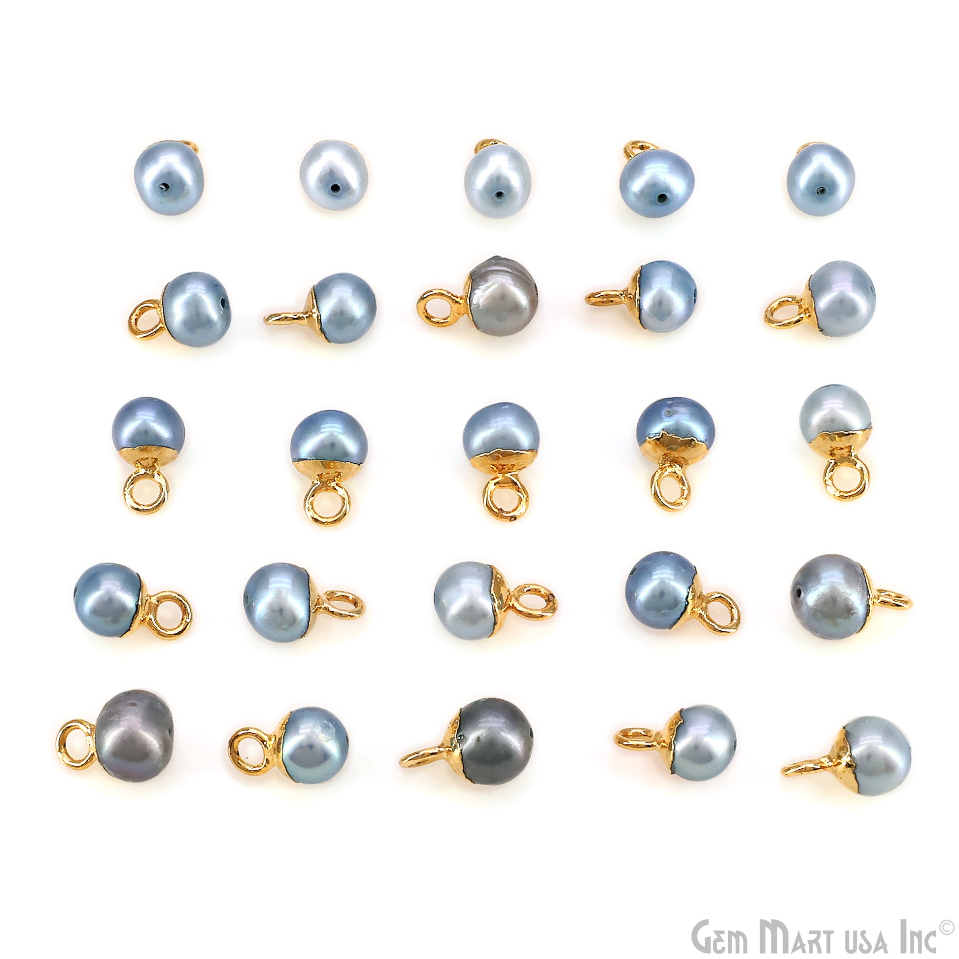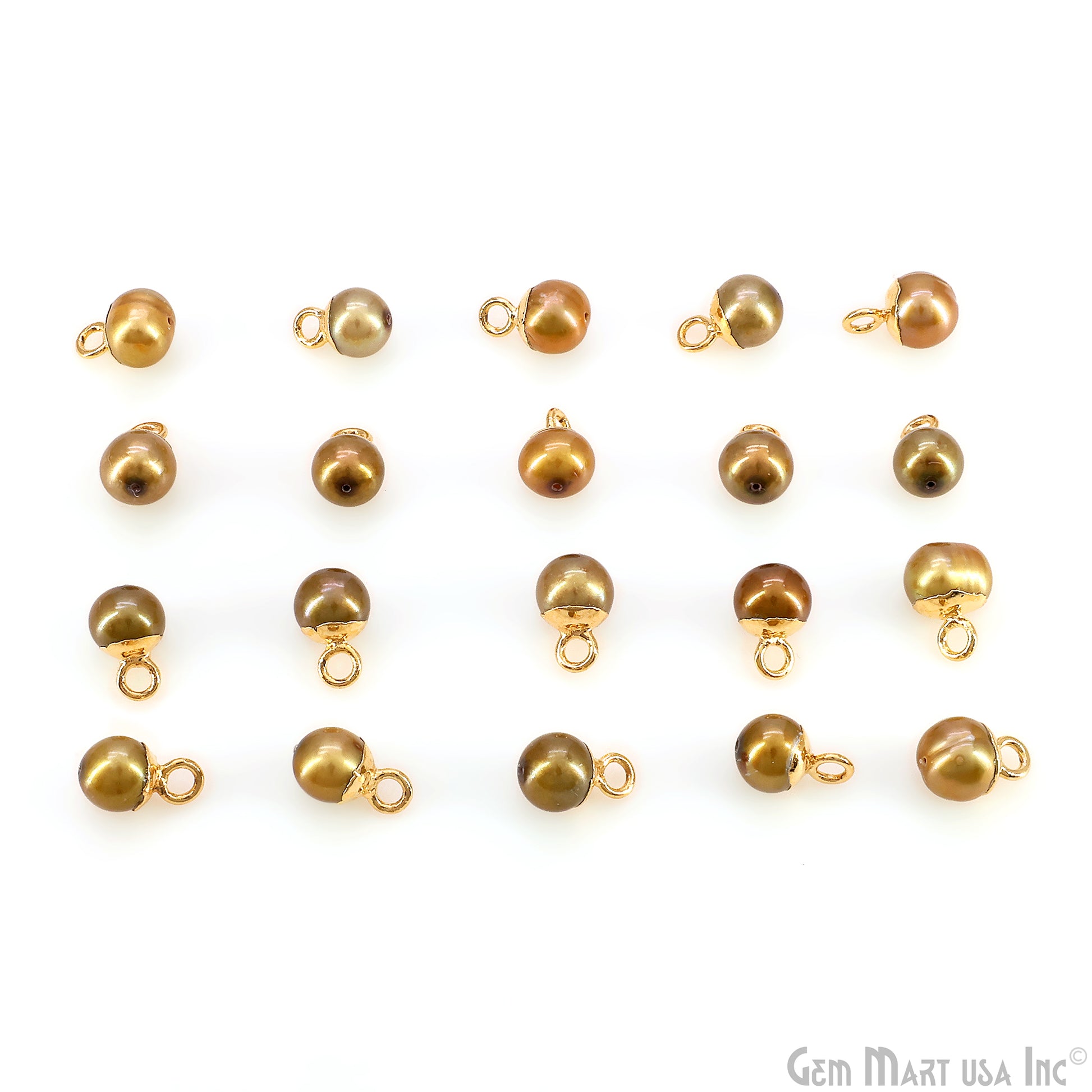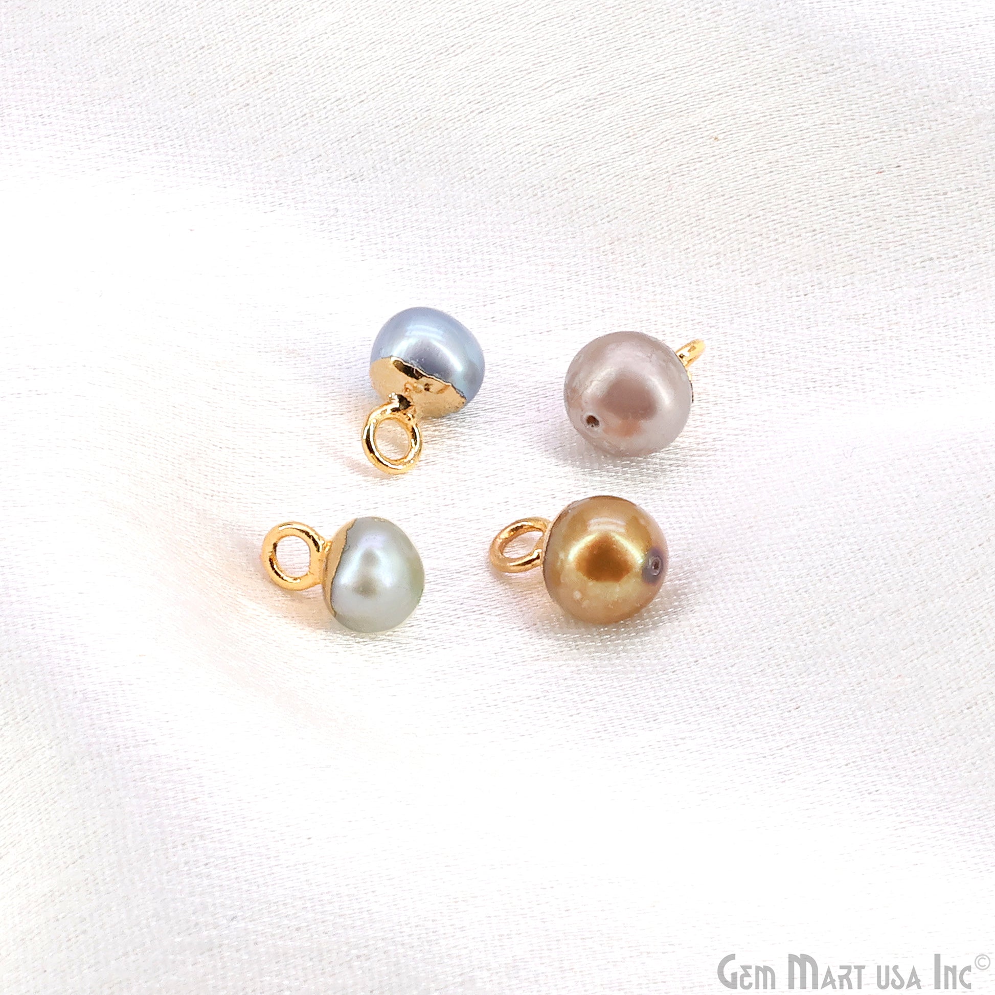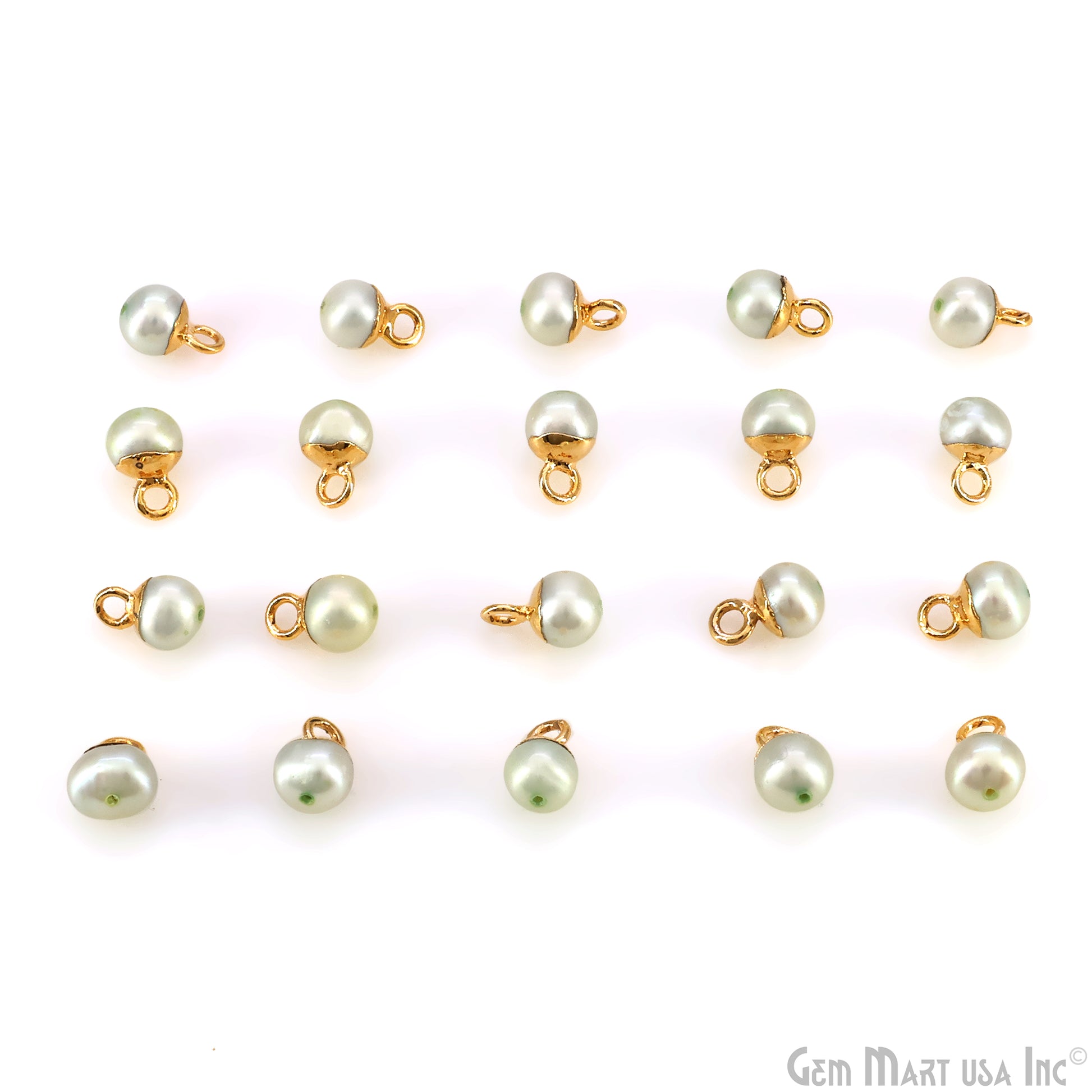 Pearl charms with 24K gold plated caps and loops. Ideal for DIY jewelry like earrings, bracelets, and necklaces. Each round pearl has a smooth finish, perfect for elegant designs.