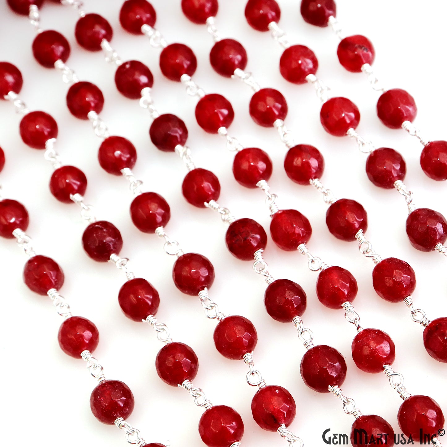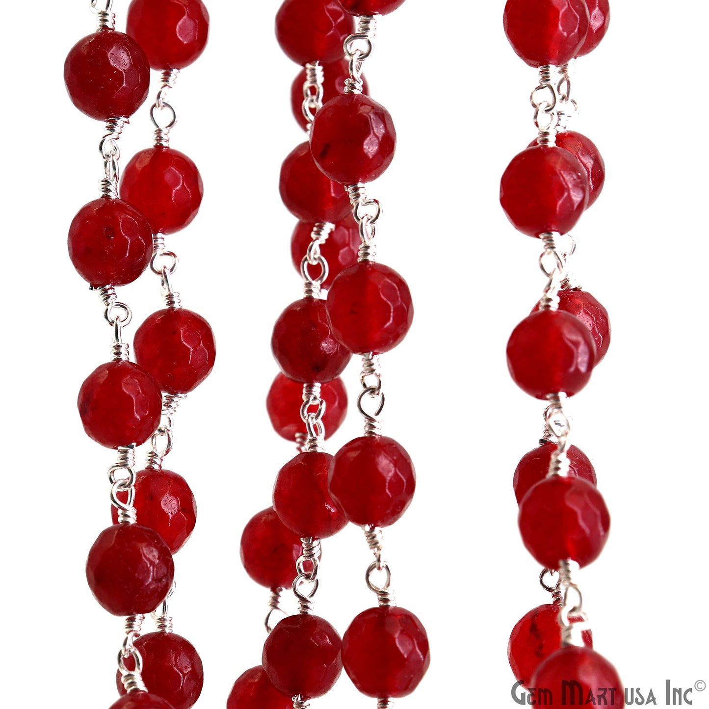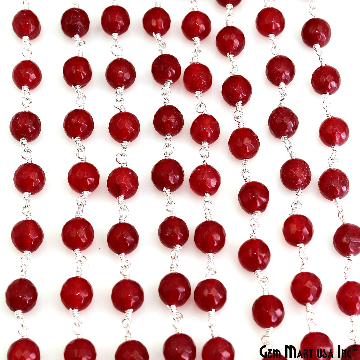 Red jade Faceted Beads 8mm Silver Wire Wrapped Rosary Chain
